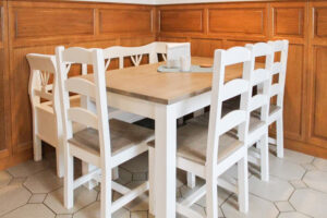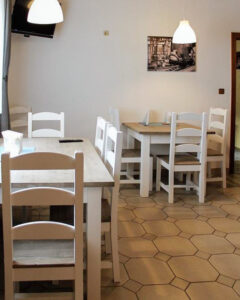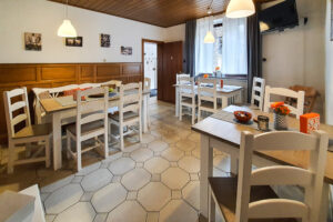 Ein geräumiges Esszimmer (mit TV) steht allen Gästen zur Verfügung.